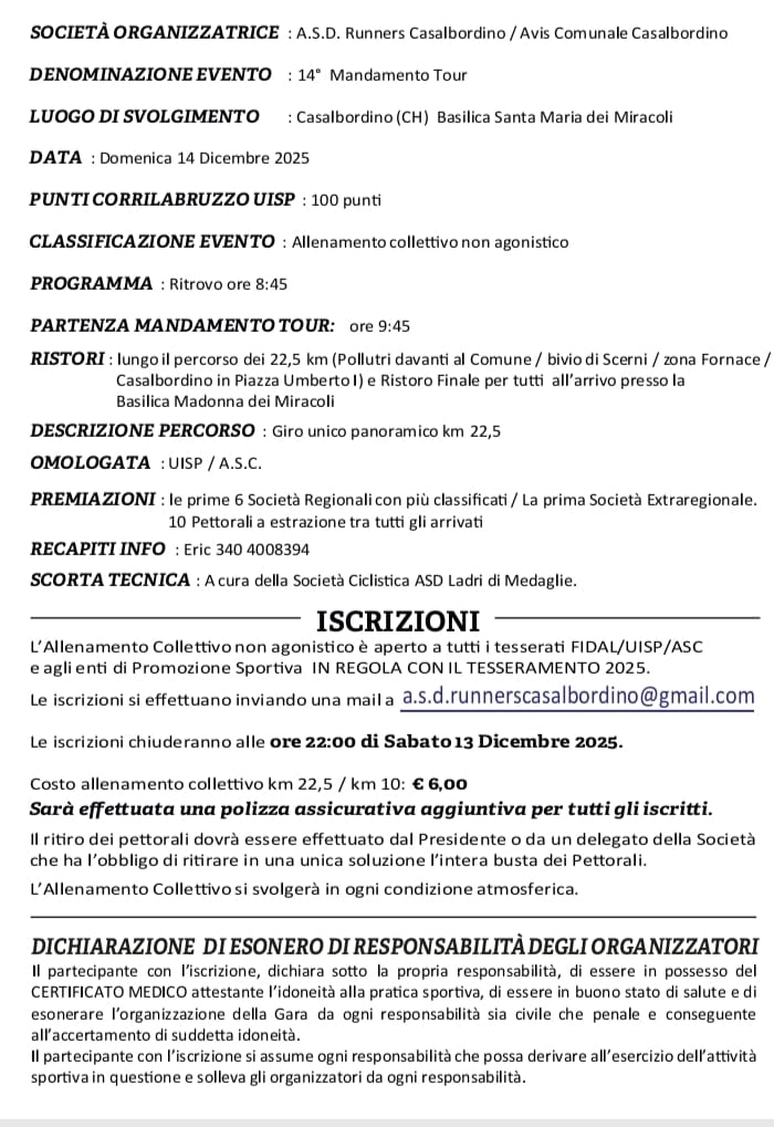 LE ISCRIZIONI SARANNO CHIUSE ALLE ORE 15 DEL 13/12/2025 - ISCRIZIONE € 6,00 - MANIFESTAZIONE NON COMPETITIVA